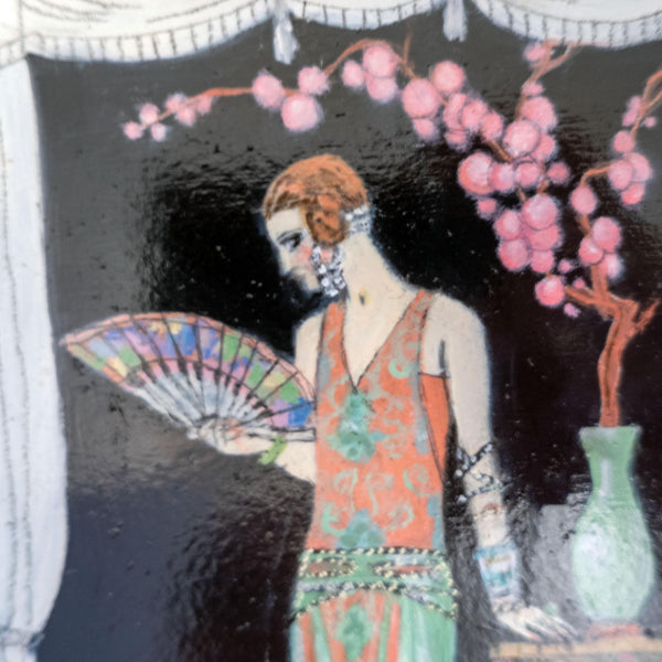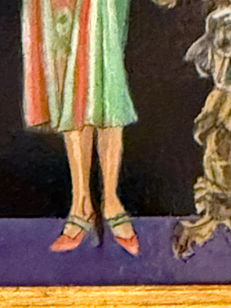 Oil painting of a woman in an art deco style dress holding a fan in a, gilded/ gold finished frame. The oil painting is on a wood panel inspired by a French artist Georges Barbier painting La Belle Personne, by Georges Barbier (1882-1932), from Le Pavillon de L' Élégance: L' Exposition Des Arts Decoratifs et Industriels Modernes, from Gazette du Bon Ton.circa 1925. The painting is done by me and not a mass item purchased overseas. The frame is has ornate detailing and is hand gilded with gold leaf and then aged to match the era of the original. The colors in this painting are jewel greens, oranges, pinks, lavender, browns, golds,whites, tans and creams. It's framed in an ornate, gilded, gold frame. The artwork is 5"x 5" and in a 12" x 12" frame. Ready for hanging.