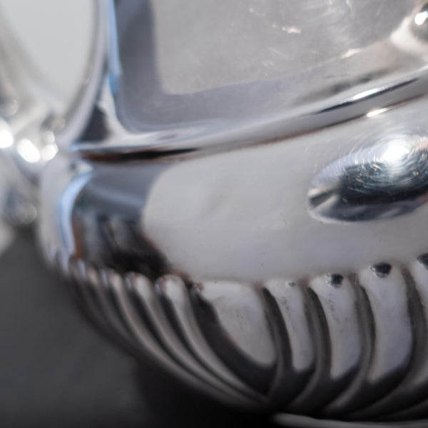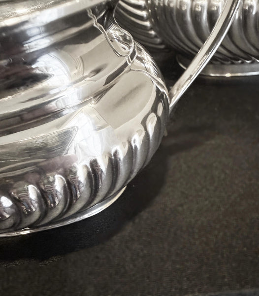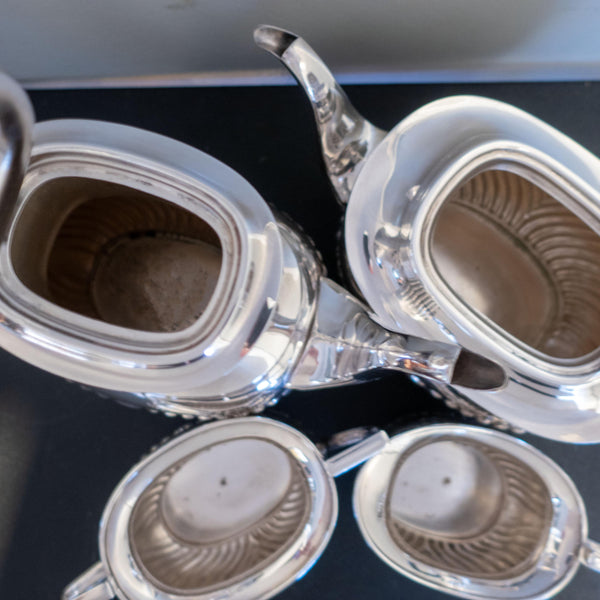 This set is in good antique condition for it's age and use. May have standard signs of age and use such as slight surface scratches, tarnish, polish residue, light wear, etc. There is a light bruise on one side of the coffee pot which I wasn't able to capture in a picture and a tiny ding on the side of the sugar bowl (see pic). Insides are clean with some light staining in the coffee pot that will rinse out (looks like residue from a previous clean). No apparent damage I can see.