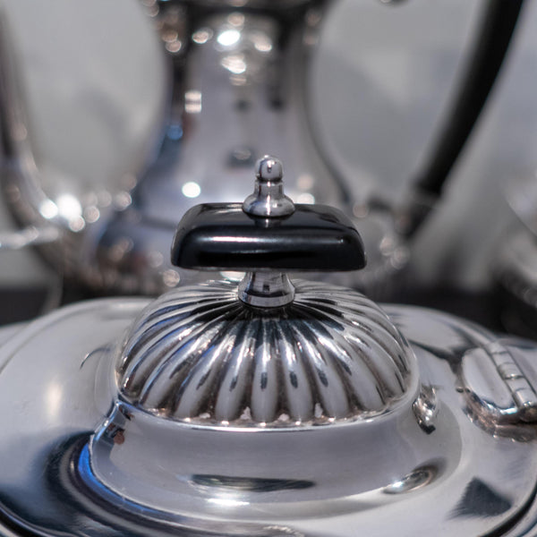 Gorgeous, antique, Edwardian, silverplate/hard soldered tea set made in Sheffield, England. Each piece has an ornate, fluted base and lid. The coffee and teapot have ebonized handles and finials. In gorgeous condition!