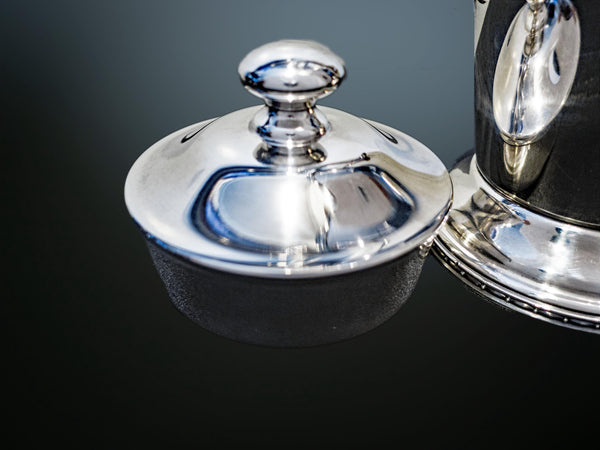 Beautiful, vintage, unique, silverplate, cocktail shaker/ pitcher by Middletown Silverware Co. This tall shaker is different in that it's shaped like a pitcher, it's tall and sleek and has a large cap. There is an ornate ice strainer near the lip. The middle, base and rim have a unique design and the handle is topped with a scrolling leaf. Gorgeous piece for your bar or for any of your favorite beverages.