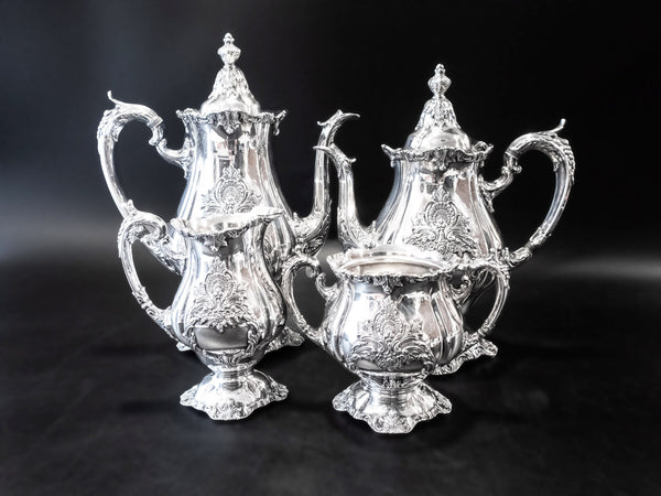Absolutely breathtaking, Christopher Wren, full tea/coffee service from Wallace. The set Includes Coffee pot, teapot, creamer and sugar bowl. Each serving piece has a bulbous body with ornate, floral cornucopia embellishments on the bodies, handles, base, spout and finials. Beautiful, sturdy and heavy, this pattern is very hard to come by. Here is your chance to have it now.