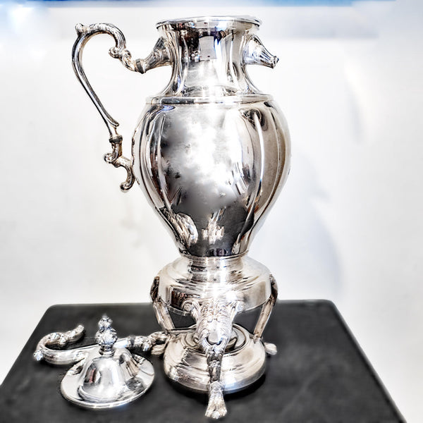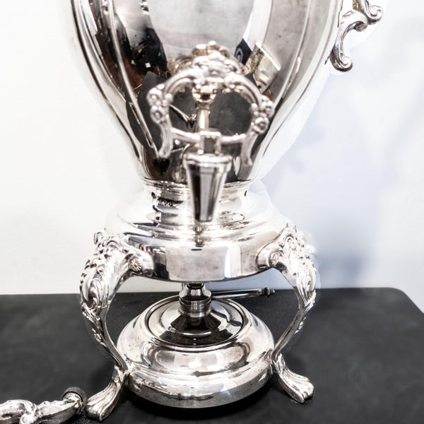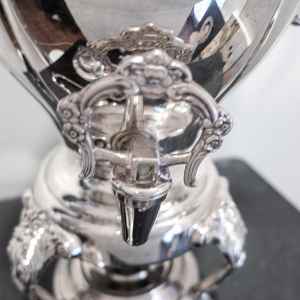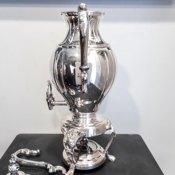 For Repair a vintage, silver plate, coffee urn, hot water dispenser by Sheridan Silver Co. It stands tall with an oval belly. It has lion feet and a floral spigot. In lovely condition and in working order. It only needs the arm repaired (reattached).