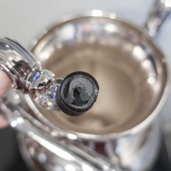 The coffee urn is in good vintage condition. May show some signs of wear for it's age such as small surface scratches, possible tarnish, polish residue and dark areas underneath where the burner heats the underside. The inside has some light staining from coffee or tea. No obvious damage other than the aformentioned handle.
