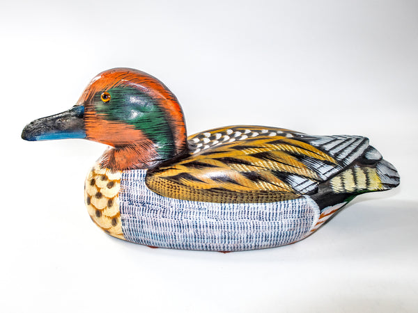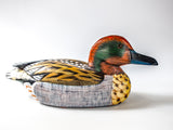 Vintage, hand carved and hand painted, Green Winged Teal Drake, duck decoy/ sculpture. Beautiful, very detailed painting. Each stroke looks like a feather. Has realistic, taxidermy eyes and deep colors. Gorgeous to have on display.