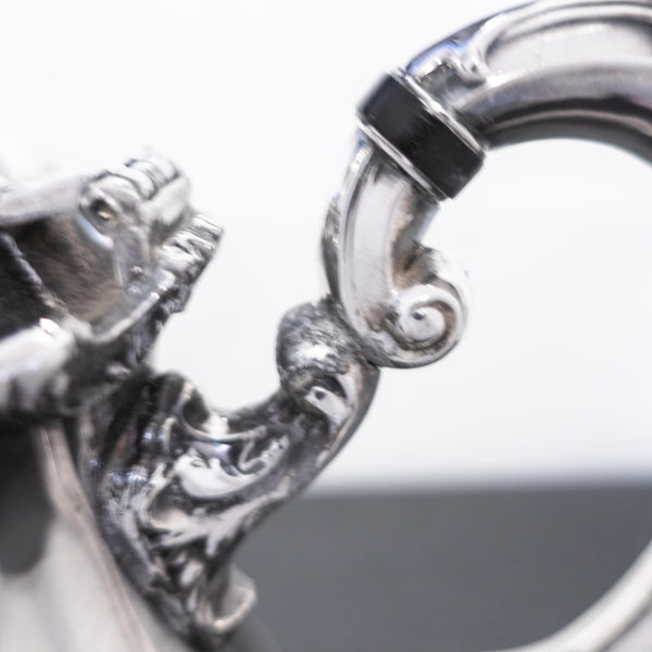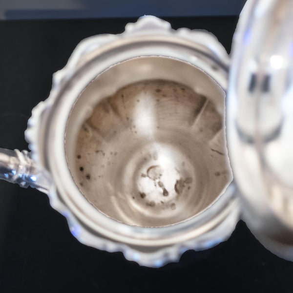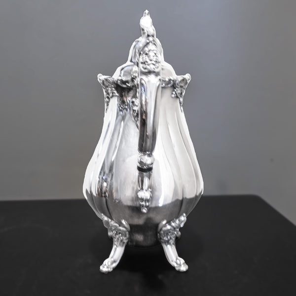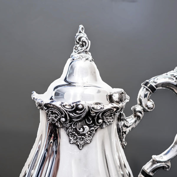 This vintage silver plate coffee/tea pot by Wallace exudes sophistication with its ornate Baroque pattern. The pot has floral motif around the rim, handles and feet and a sweet "magic pumpkin" style body. Experience timeless elegance with this exquisite piece. Please read the rest of the description, **