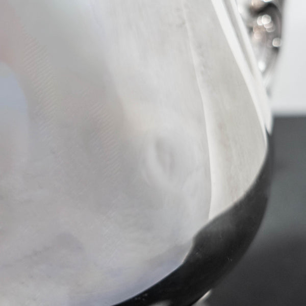 This piece is in good, vintage, condition. May have typical signs of use such as light surface scratches, possible polish residue and/or tarnish and very small bruise on one side that I cant quite capture in picture (see last pic). The inside of the pot is in good condition with very light staining, if any. There appears to be a light possible repair to the handle(see picture), but blends very well and seems sturdy-please keep in mind when bidding. No other obvious damage.