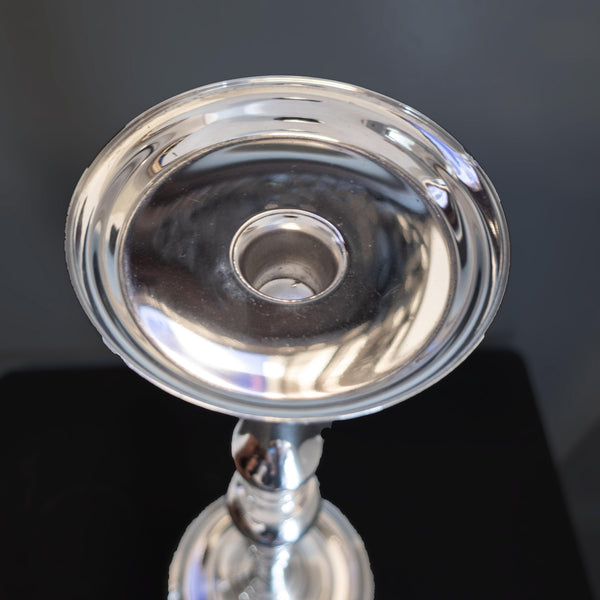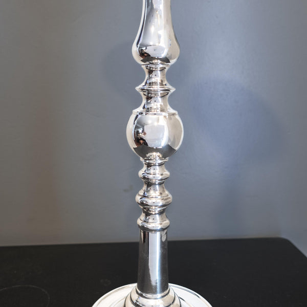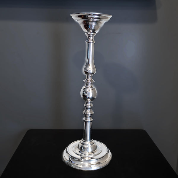 Vintage, silver plate, tall, candle holder, 16 1/2" tall. The candle holder features an ornate ball and flute design. Has a velvet base. It holds from a thin tapered candle to a 3 1/2" diameter candle. It makes a great centerpiece candle to a wonderful hearth decor.